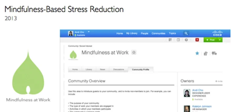 I launched the "Mindfulness at Work" study group at Cisco to promote MBSR awareness in a fast-paced, high-stress environment. The initiative aims to help employees become more focused, balanced, and happy, ultimately fostering greater productivity and well-being.